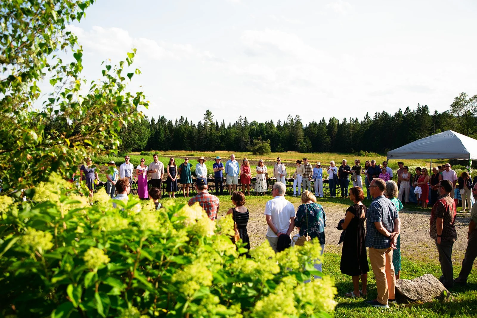 Our dinner kicked off with a welcome hour where guests enjoyed their first heirloom botanical-infused cocktail or mocktail, grabbed their first bite from our chefs in the field kitchen, and took in the sweeping views of the farm.
